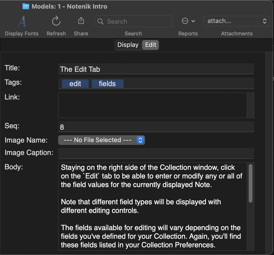 Staying on the right side of the Collection window, click on the Edit tab to be able to enter or modify any or all of the field values for the currently displayed Note.